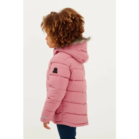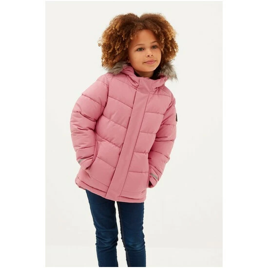 Pretty and practical, the super warm, wind resistant Wheatley premium quilted jacket for girls comes with a cosy, fixed hood that has a detachable faux-fur trim, so it works for everything from birthday outings to school days. Quilted in chunky, chevron baffles with a warm, insulated filling and two lower pockets that double up as hand warmers, this coat will stand up to the coldest days and has a Velcro adjuster tab at the back of the hood, so it can be shaped around the face to keep the wind out. There is a full length, easy pull zip at the front in a tonal colour to match the hood lining and you’ll find neat reflective silver prints above the cuffs and back hem that stand out against car lights for increased visibility at night. Designed in West Yorkshire with all the care and attention that we give to our adults ranges, you’ll find our iconic embossed rubber Yorkshire Rose badge on the sleeve.